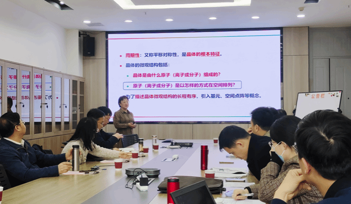 黄云霞副教授以《固体物理》课程中的“晶体的微观结构”内容为例,通过课程引入、知识点讲解、例题、小结等环节,向学院教师详细展示了本节次课程的教学过程。黄老师在如何引入知识点,激发学生的学习兴趣;如何讲解重点难点,帮助学生理解掌握知识;如何组织课堂互动,引导学生积极思考等方面进行了系统的讲解,助力青年教师站稳站好讲台。